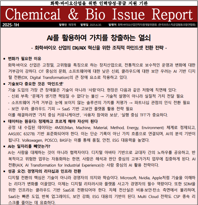 화학·바이오ISC, 2025년도 상반기 이슈리포트 발간 2025-07-16 0 19793 07.16 11:28 2025.07.16 11:28 2025년 상반기_이슈리포트_AI를 활용하여 가치를 창출하는 열쇠.pdf (186.0K) + 0 화학·바이오산업인적자원개발위원회(CHEMISC)에서 작성한'AI를 활용하여 가치를 창출하는 열쇠'를 배포하오니 업무에 참고하시기 바랍니다.켐바이오넷 바로가기