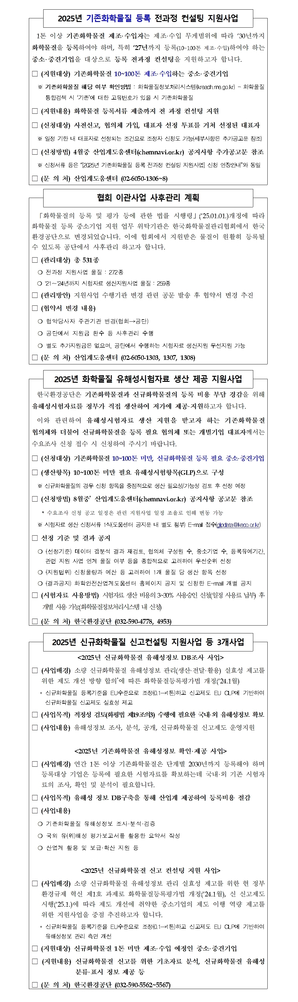 2025년 한국환경공단 지원사업(기존 화학물질 등록 전과정 컨설팅, 시험자료 생산 지원 등) 안내 2025-04-04 0 19788 04.04 16:13 2025.04.04 16:13 한국환경공단 2025년 화학물질 등록 등 지원사업 안내자료.zip (6.1M) + 1