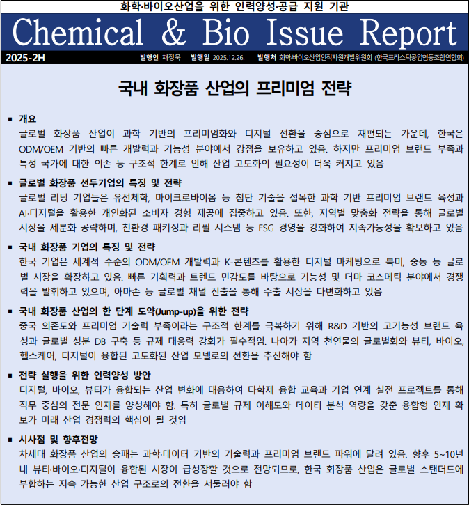 화학·바이오ISC, 2025년도 하반기 이슈리포트 발간 2026-01-12 연합회 0 208 01.12 10:11 2026.01.12 10:11 2025년 하반기 화학바이오ISC 이슈리포트.pdf (185.9K) + 0 화학·바이오산업인적자원개발위원회(CHEMISC)에서 작성한'국내 화장품 산업의 프리미엄 전략' 배포하오니 업무에 참고하시기 바랍니다.▶ 켐바이오넷(https://chembio.or.kr) 바로가기
